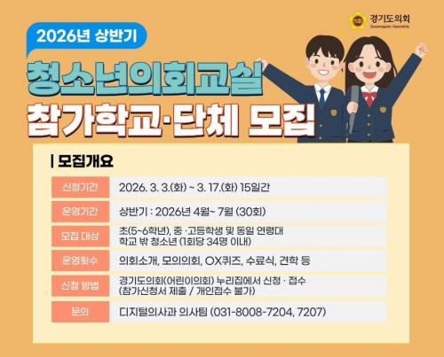 [¸ÅÀϹæ¼Û=È«¼®ÁØ ±âÀÚ] °æ±âµµÀÇȸ°¡ 2026³â »ó¹Ý±â 'û¼Ò³âÀÇȸ±³½Ç'¿¡ Âü¿©ÇÒ Çб³ ¹× ´Üü¸¦ ¸ðÁýÇÑ´Ù.